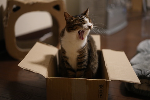 ふるさと納税のポテチ段ボールに乗り込むとら(とら麦23)