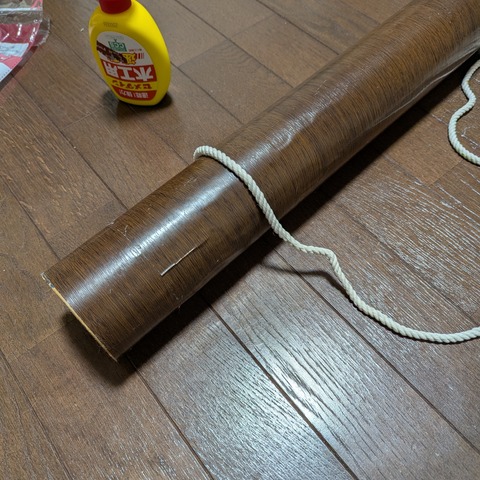 爪とぎに巻きなおしてる時の写真が出てきた(´∀`*)ボイド管にリメイクシートを張ってその上から綿ロープまきまき100均のロープで15㎝くらいまけてるか···