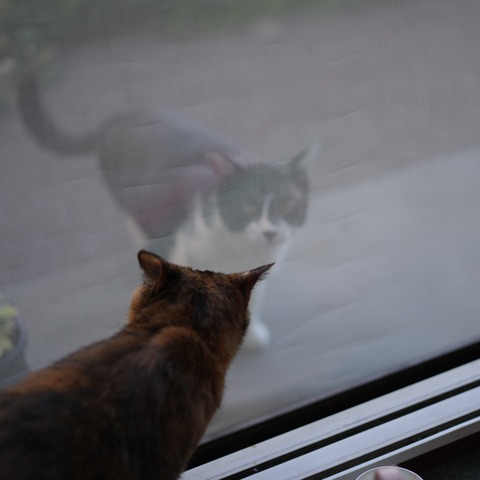 網戸越しの攻防とテレビで弐画面(猫2826)