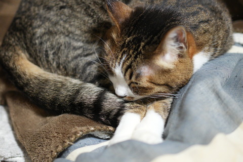 ねむねむとらやんをかわいく撮りたい(´∀`*)おててそろえてるのかわいいんだけども。しっぽに顔乗っかってるのもかわいいと思う。鼻、くすぐったくな···