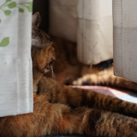 カーテンの裏にすっぽり麦ちゃんとニンテンドースイッチ2の予約が気になる飼い主と(猫2···