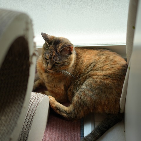 隅っこで落ち着いていた麦ちゃんと「ちゃん付がセクハラ」の記事(猫2855)