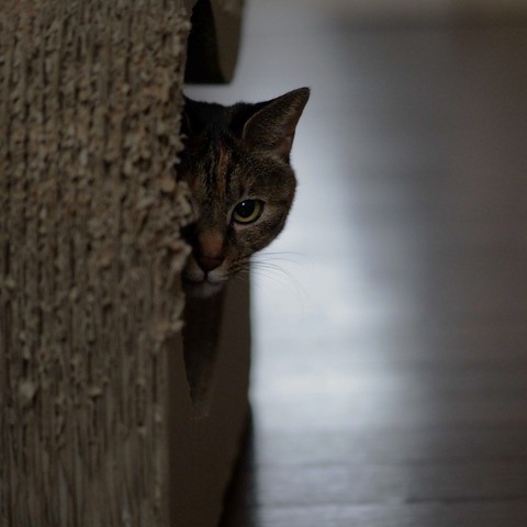 影から見てる麦ちゃんとソファほしいって言いだす飼い主と(とら麦41)