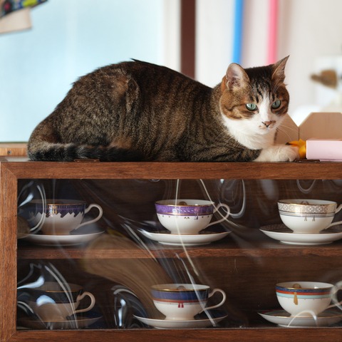 ティーカップ置き場の上のとらやんと「と5」が「とら」に見える病の飼い主と(猫2878)