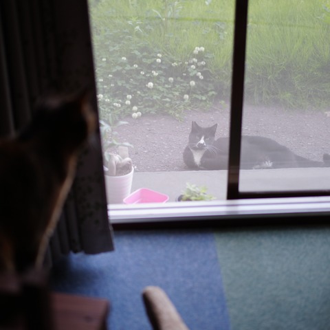 網戸越しの野良ぬっこたちと「ピクトレ」やり始める飼い主と(猫2813)