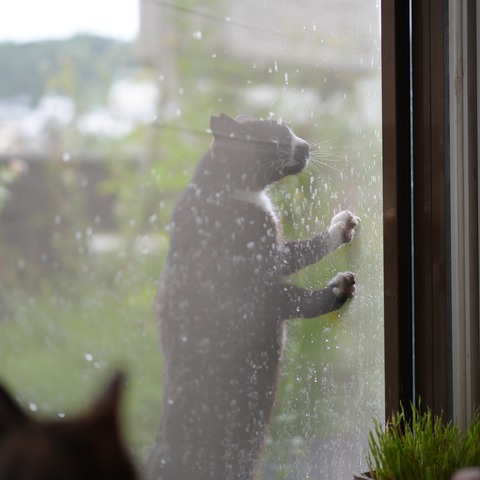 網戸に手をかけるクロちゃんと風呂場にハイターぶちまける飼い主と(猫2845)