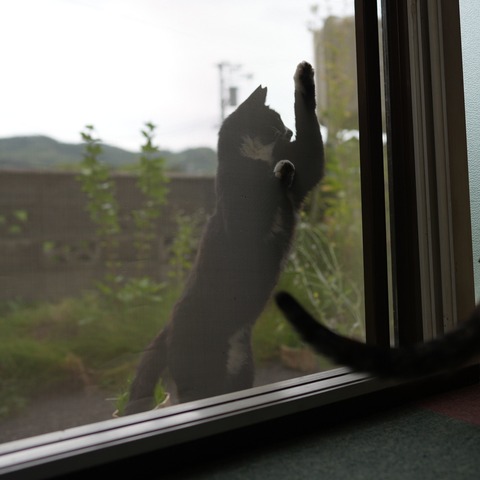 網戸大好き(?)クロちゃん。隙があればそして気分が乗れば我が家の網戸を襲撃しに来るんずなー。爪とぎというわけでもないと思うけど一度やったら何か···